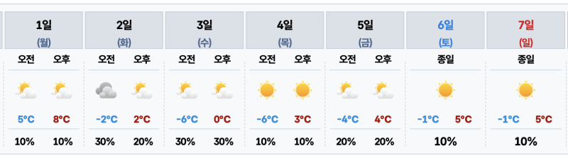 이번 주 날씨입니다. 날씨가 계속 추워지고 있습니다.