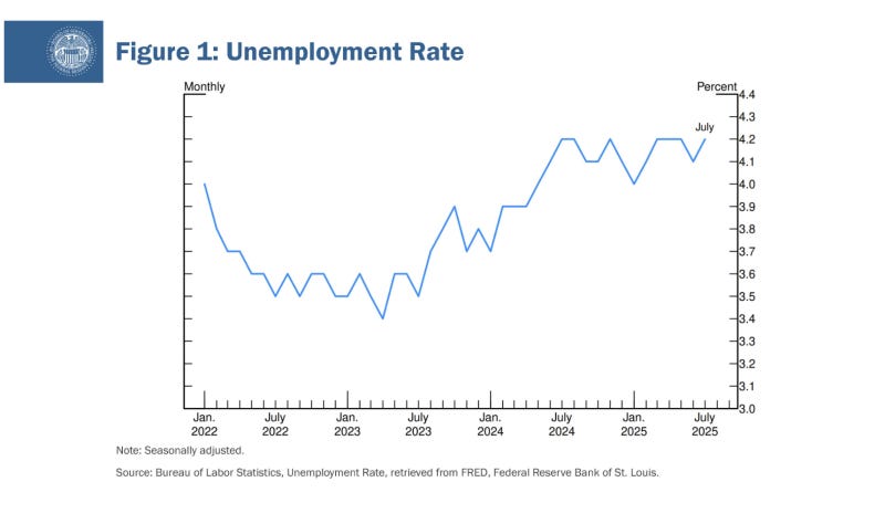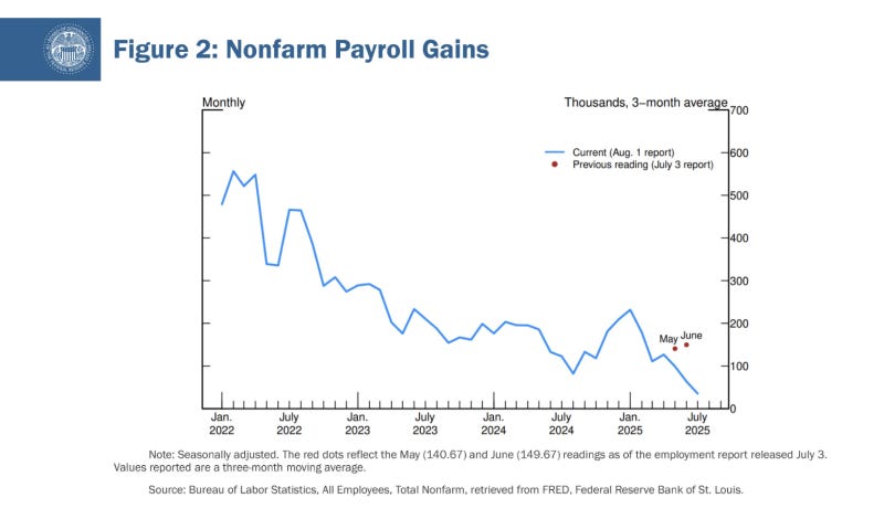 노동시장만 보아도 그렇습니다. 이달 초 발표된 7월 고용보고서에 따르면, 지난 3개월간 임금근로 일자리 증가는 월평균 35,000개로 둔화되어 2024년 월평균 168,000개에 비해 크게 줄었습니다. 또한 5월과 6월 고용 수치가 대폭 하향 조정되면서, 불과 한 달 전보다 둔화폭이 훨씬 커졌습니다.