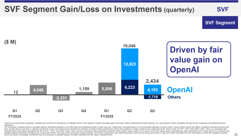 소프트뱅크 그룹의 주요 펀드 중 하나인 비전 펀드의 실적에서도 OpenAI가 차지하는 비중은 뚜렷했습니다. 비전 펀드 부문의 3분기 투자 이익은 24억 3,400만 달러를 기록했으며, 최근 7개 분기 중 6개 분기에서 흑자를 달성했습니다.