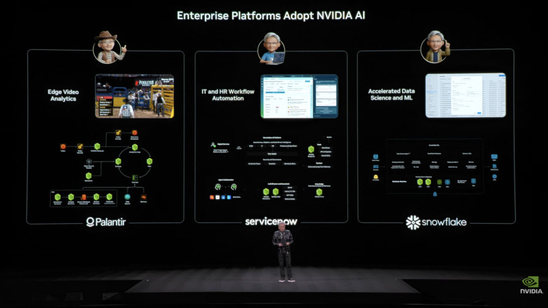 예를 들어, 팰런티어(Palantir)의 전체 AI 및 데이터 처리 플랫폼은 현재 엔비디아를 통해 통합 및 가속화되고 있습니다. 서비스나우(ServiceNow)는 세계 최고의 고객 및 직원 서비스 플랫폼입니다. 스노우플레이크(Snowflake)는 클라우드 기반의 세계 최고 데이터 플랫폼이며, 그곳에서도 놀라운 작업들이 진행 중입니다.